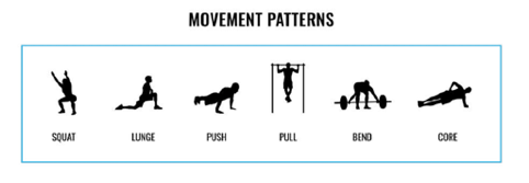 Agora o importante é saberes que avaliamos seis padrões de movimento: squat, bend, lunge, push, pull e core.