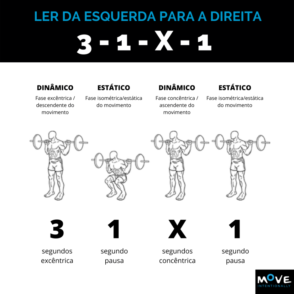 Voltemos agora ao tempo ou Time Under Tension. O tempo é usado para controlar dose-response, o controlo do movimento e a capacidade de repetires um exercício. É escrito com quatro números que correspondem, cada um deles, a diferentes tipos de contrações dentro de um movimento.